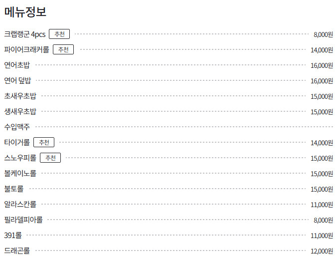 메뉴가격대구성 사이드4000~8000원 기본롤 7000~10000 새우튀김이 들어간 고급롤 11000~16000원
